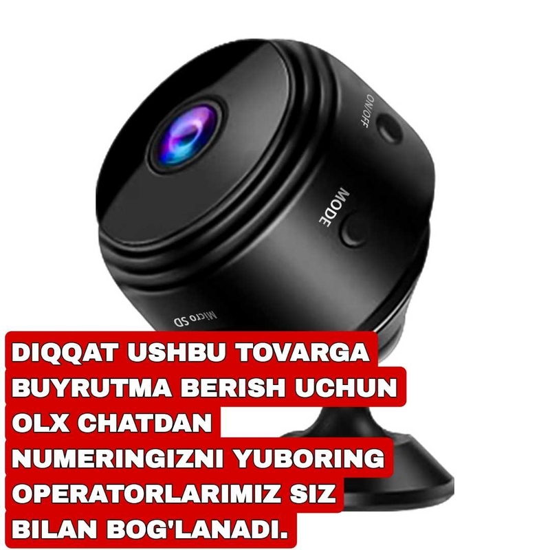 A9 kamera | Mini kamera | Chatga numer yozing operator tel qilib malumot beradi Buyrutma berish: 90 616 60 28 • Tovarni qo'lingizga olgandan so'ng to'lov • 3 kunda yetqazib beramiz • Uzbekiston bo'ylab dostavka xizmati mavjud Sizning uyingiz, ofesingiz yoki umuman istalgan joyda ushbu kameradan foydalnishingiz mumkin. Siz bu mitti kameraga mutloq ishonishingiz lozim, u sizga pand berib qo'ymaydi! Uning hajmi 43x25 mm bo'lib, masofadan WiFi orqali kuzatish funksiyasiga ega. A9 camerasi Micro SDga ega va shu orqali o'rnatilgan nuqtadan 150 keng burchakni yozib oladi.